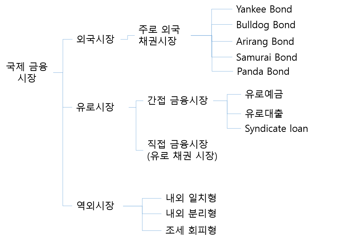 국제 금융시장은 금융시장의 전 세계 버전으로 외국시장, 유로시장, 역외시장이 대표적 시장입니다. 첫 번째로 외국시장은 주로 외국 채권시장을 일컫는데 발행주체가 외국인입니다. 또한 외국에서 본국 환이 아닌 외국환 표시 채권을 발행하여 자금 조달하는 것을 말합니다. 대표적으로 미국은 Yankee Bond, 영국은 Bulldog bond, 한국은 Arirang bond, 미국은 Samurai Bond, 중국은 Panda bond가 있습니다. 예를 들어 미국에서 한국환 표시 채권을 발행하여 자금을 조달하는 경우, 미국 달러가 아닌 한화 표시 채권을 발행하므로 Arirang bond로 발행한다고 합니다. 마찬가지로 한국에서 미국이 미국 달러 채권을 발행하여 자금을 조달하는 경우, Yankee Bond가 됩니다.