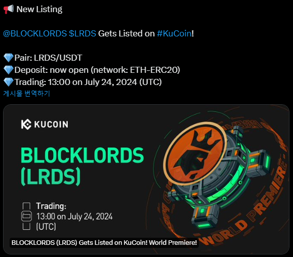 23일 저녁 blocklord 관련TGE가 떴습니다. 한국시간으로 7월 24일 오후 11시 쿠코인 상장하네요