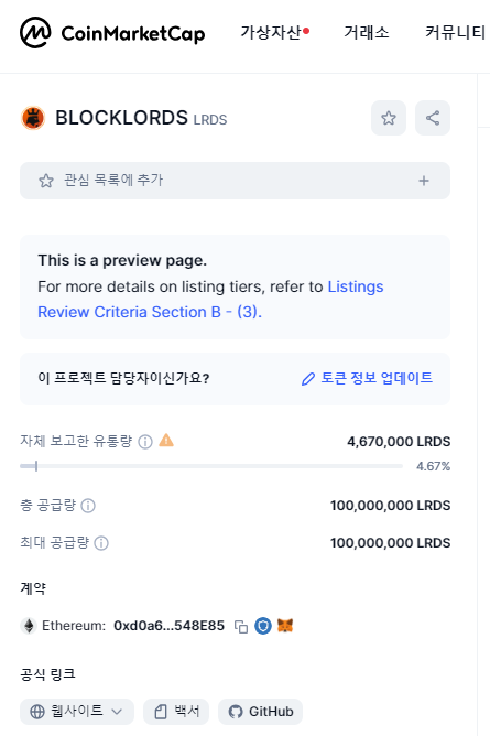 게다가 코인마켓캡에 올라온 LRDS 토큰 정보!