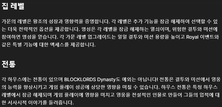 그 뿐만이 아니라 아래를 보시면 집의 레벨로 가문을 성장시킬 수 있고 하우스 전통도 있다고 해요