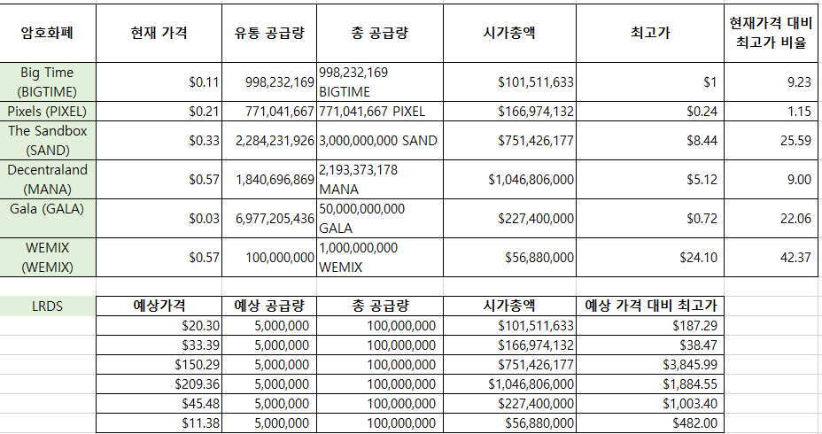 +추가로 LRDS토큰 가격전망을 보기 쉽게 현재 P2E코인과 비교해 보았는데요.