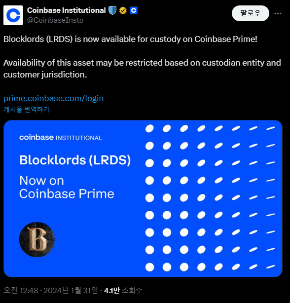 또한 1월에 이미 코인베이스 프라임 블록로드 커스터디 트윗이 된적이 있어요