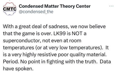 8월 3일 한국 초전도저온학회가 상온 초전도체로 보기 어렵다는 입장을 밝히며 관련주들이 시간 외 거래에서 주가하락을 하였고, 8일 다시 20% 넘게 급등세를 보였던 관련주들이 위의 CMTC의 발표가 나오자 급락하였습니다. 메릴랜드 대학교 응집물리이론센터 역시 LK-99가 초전도체가 아니라는 입장입니다.