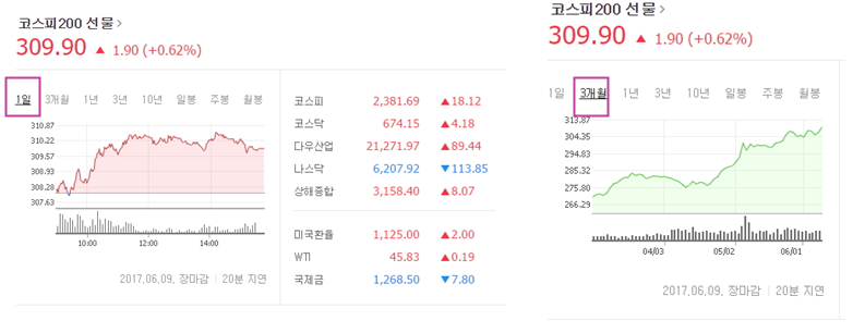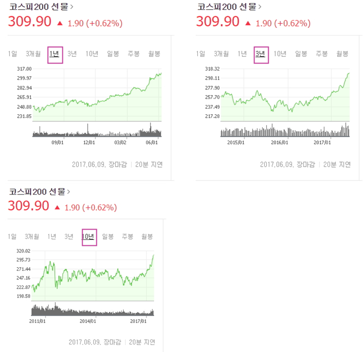 Speculate 전략은 자신의 의사결정에 따라 단기적인 이익을 추구하여 위험도 감수하는 전략입니다. 아래 그림은 2017년 기준 코스피 200 선물의 1일, 3개월, 1년, 3년, 10년간의 수익률을 나타낸 그래프입니다. 최근 1년간 보면 계속 오름의 추세에 있지만 3년 그래프나 10년 그래프를 보면 최고점을 찍고 내려간 것이 보였습니다.