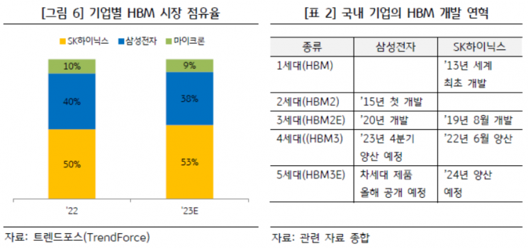 한국의 탑2 기업이 이번 2분기 실적발표에서 HBM을 핵심으로 발표하였다. sk하이닉스는 전체 매출의 20%를 HBM으로 만들겠다고 발표한 바 있으며, 삼성전자는 HBM의 생산능력을 2배로 증설하겠다고 하였다. 두 회사 모두 이번에 적자를 기록한 탓에 새로운 도전을 응원한다.