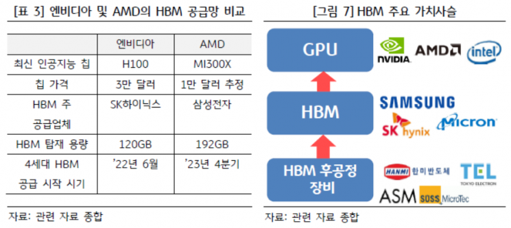 HBM(고대역폭 메모리)란 High Bandwidth Memory의 약자로 여러 개의 D램을 수직으로 쌓아 데이터 처리 능력을 높인 고성능, 고용량 차세대 메모리로 생성형 AI가 인기를 끌며 주목받고 있는 메모리이다. AI와 자율주행 등과 함께 수요가 증가할 것으로 예상되는 메모리이다. 관련주로는 sk 하이닉스, 엠케이전자, 시그네틱스, 에스티아이, 제우스, 테스, 피에스케이 등이 있다.