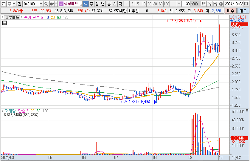 주사형 피부이식재인 '셀루덤 필'의 시제품 생산을 완료, 상용화에 대한 임박 기대감으로 상한가를 갔습니다.