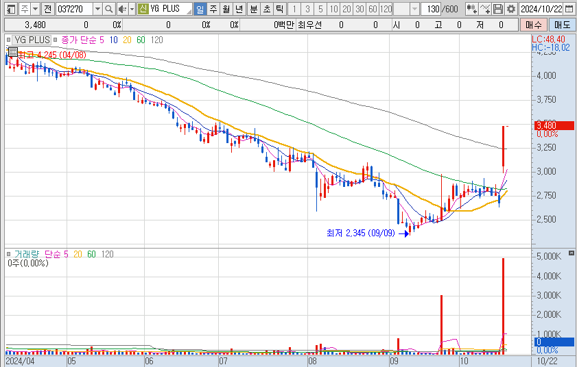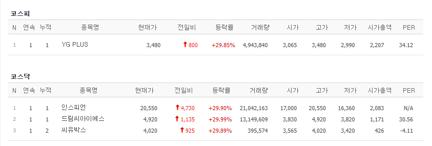 로제의 아파트 노래가 유행하며 글로벌 흥행 조짐에 이곡의 유통을 맡고 있는 YG PLUS가 상한가를 갔습니다.