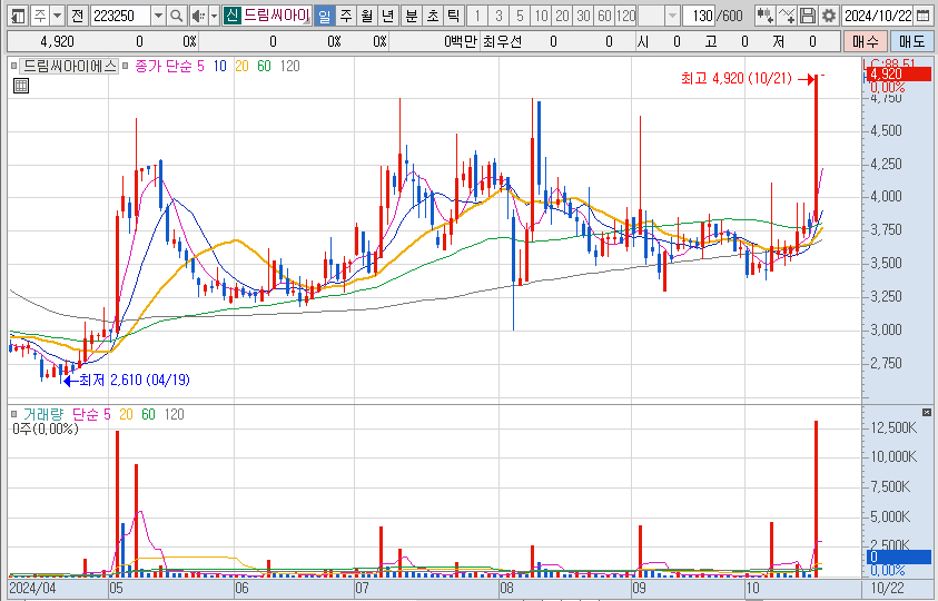 드림씨아이에스 주가가 시간외 매매에서 급등했다.21일 한국거래소에 따르면 지난 18일 시간외 매매에서 드림씨아이에스 주가는 종가보다 1.06% 오른 3825원에 거래를 마쳤다. 드림씨아이에스의