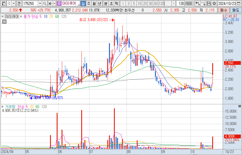 아이큐어는 셀트리온과 알츠하이머 치매치료 개량신약인 '도네페질' 패치를 브라질 등 중남미 17개국에 독점 라이선스 공급계약을 체결한다는 소식에 상한가를 갔습니다. 이 계약은 총 마일스톤 최대 75억원, 공급 규모는 중남미 국가 허가승인 시점부터 10년간 836억원 이라고 합니다.