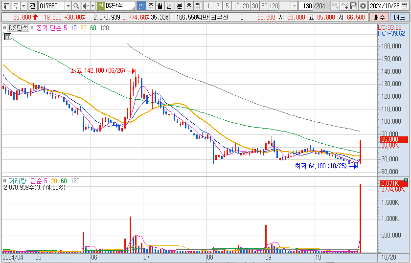 미국의ㅣ 정제 대기업인 필립스 66에 1조원대 지속가능한 바이오항공유 전처리 제품 계약을 체결했다는 소식에 상한가를 갔습니다.