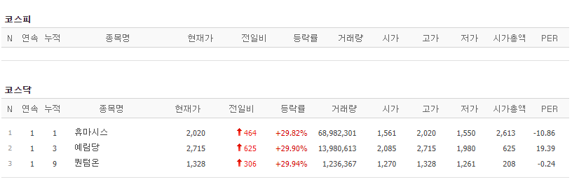 오늘의 상한가 시작합니다