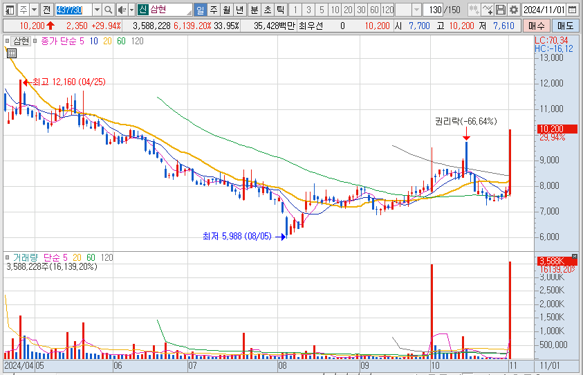 삼현은 레이저 대공무기 체계에 전자광학 추적장치, 열 에너지를 제어하고 교환하는 역할을 수행하는 표적획득지시 장비를 양산중이어서 상한가를 갔습니다.