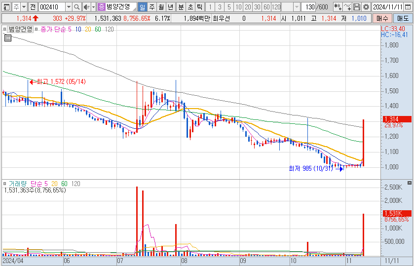 범양건영 역시 우크라이나 재건주로 상한가를 갔습니다.