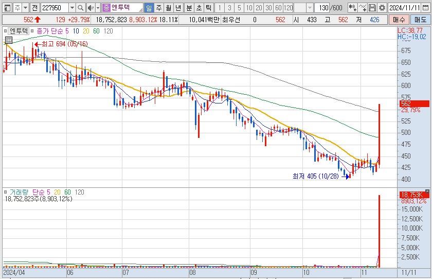 LG에너지 솔루션의 스페이스X 배터리 납푸모식으로 지오릿에너지의 최대주주인 엔투텍도 상한가를 갔습니다.