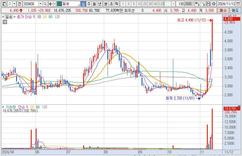 트럼프 트레이드가 지속된다는 발언에 조선 관련주인 일승이 상한가를 갔습니다.