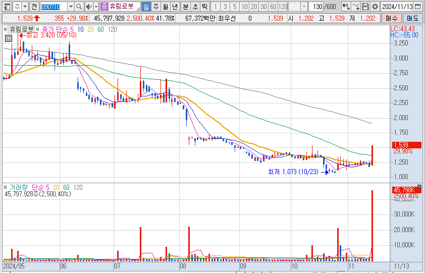 주식양수도 계약 체결으로 이큐셀의 최대주주가 휴림로봇이 되었다는 소식에 상한가를 갔습니다.