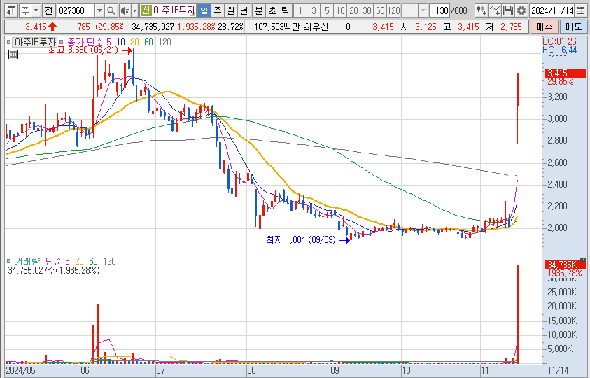 그룹사의 스페이스X 4000억 투자 소식에 상한가를 달성했습니다. 스페이스X는 일론머스크가 CEO로 있고, 이번 트럼프 대통령 당선으로 기대가 큰 그룹이지요.