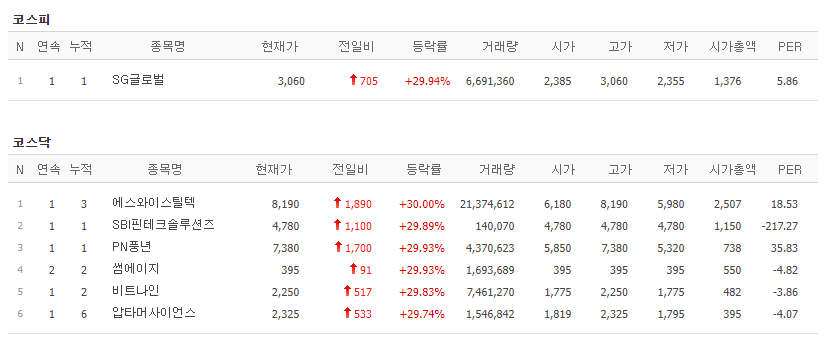 일주일의 마지막 금요일 오늘의 상한가입니다.