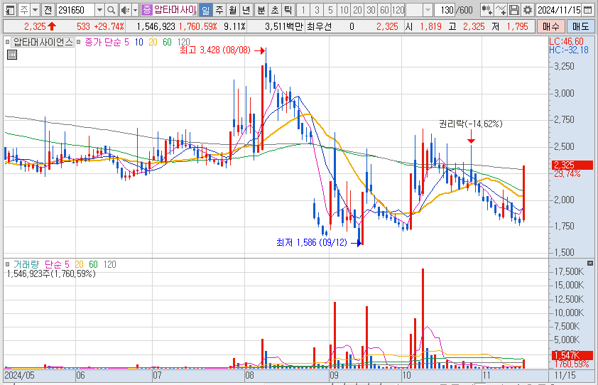 고형암 간암 치료제의 임상을 올해 안에 시작할 계획이고 비만치료제 등으로 포트폴리오를 확장한다고 밝혀 상한가를 갔습니다.