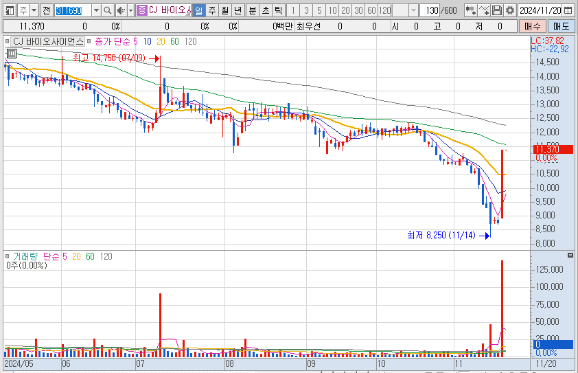 CJ그룹이 사업을 제편하면서 CJ제일제당이 바이오 사업부문을 매각한다는 소식에 상한가를 갔습니다.