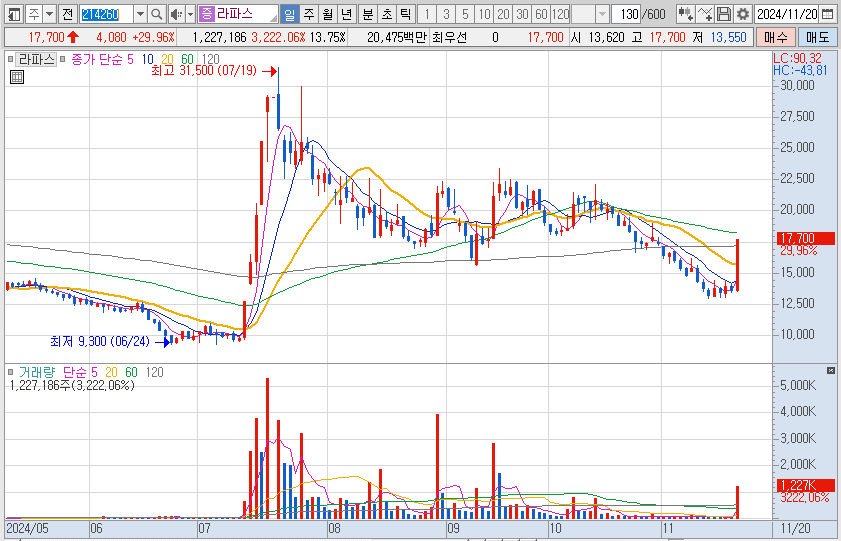 사료관련주입니다. 종합축산식품기업으로 실적호전 기대감으로 상한가를 갔습니다.