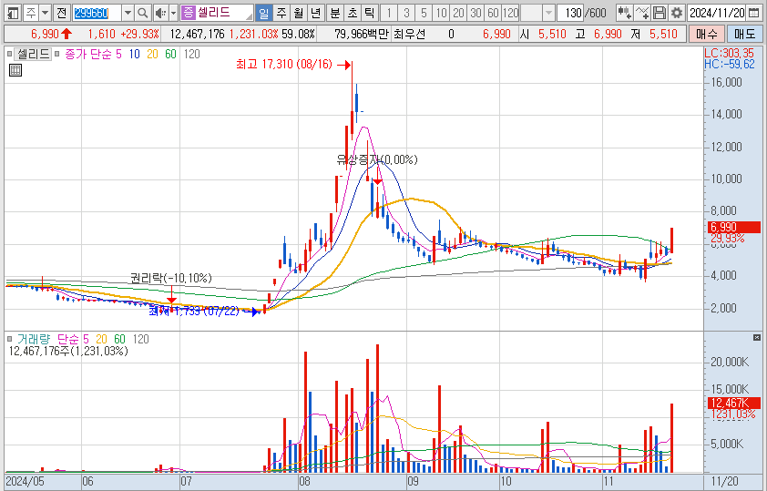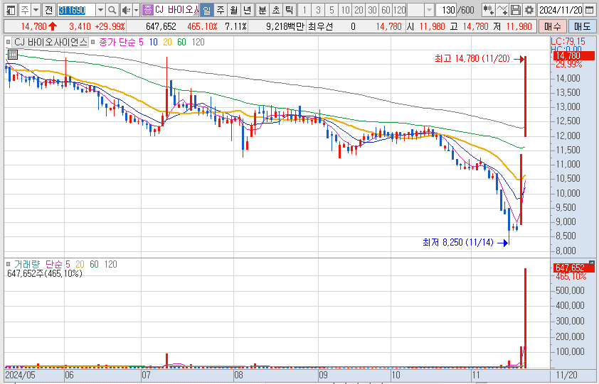 두경부세포함 임상실험 승인 소식에 상한가를 갔습니다.