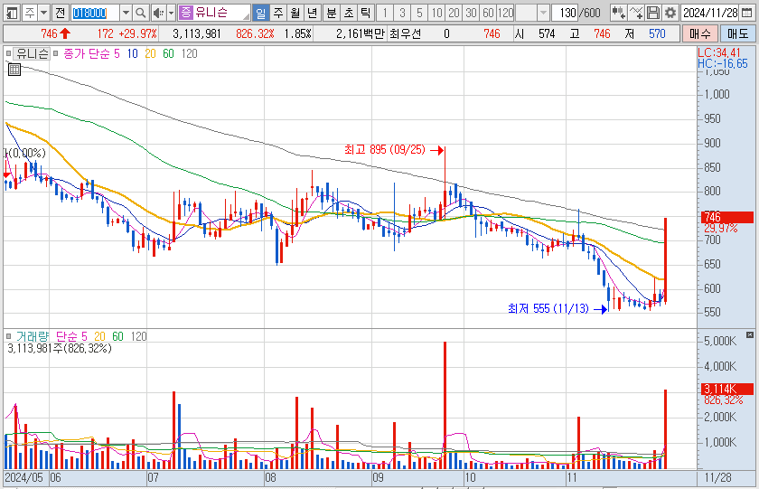 풍력발전 기업인 유니슨이 한빛해상풍력과 국산10MW급의 해상풍력터빈 34기에 대한 터빈공급 계약을 체결했다는 소식에 상한가를 갔습니다.