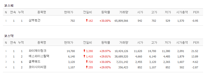 6일 삼부토건, 와이제이링크, 에스와이스틸텍, 셀루메드, 코아시아씨엠이 상한가에 이름을 올리고 장을 마감한 가운데 투자자들의 관심이 뜨겁다.이날 코스피 시장에선 삼부토건이 상한가에 이
