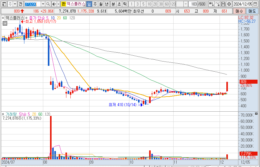 엑스플러스의 투자조합 지분 매각 공시 소식으로 상한가를 갔습니다. 차입금 부담을 줄이고 유동성을 확보하여 실적개선 기대감이 돋보입니다.