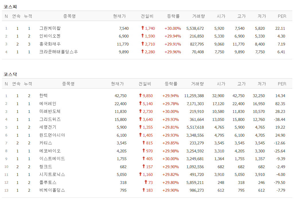 그린케미칼: 저탄소 에너지 관련주. 국내 유일 저탄소 에톡실레이션 공정 기술을 보유한 기업으로, 차기 정부에서 기후에너지부 신설 가능성이 부각되며 상한가