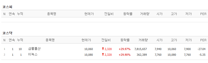 7월 11일 오늘의 상한가 삼륭물산 이녹스