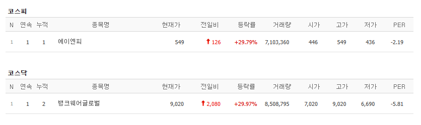 7월 11일 오늘의 상한가 에이엔피 뱅크웨어글로벌