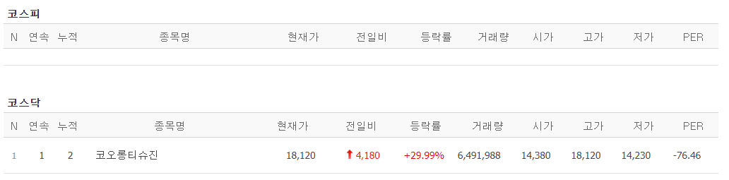 오늘의 상한가 종목은 하나 코오롱티슈진입니다.