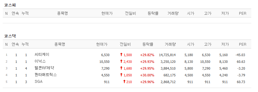 상한가 종목을 보겠습니다. 코스피는 없고, 코스닥 종목만 있습니다.