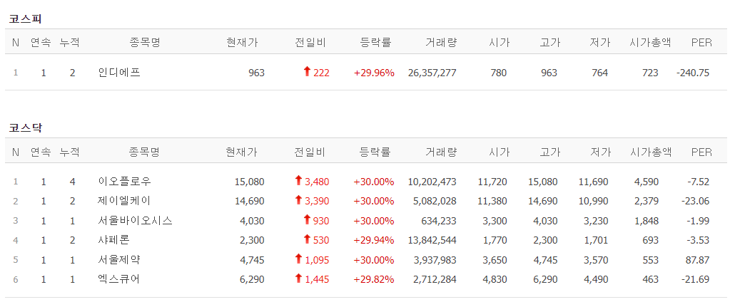 안녕하새요 7월 17일 오늘의 상한가입니다.