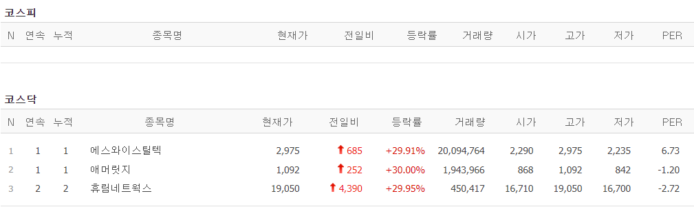 최근들어 코스피 상한가 주식이 보이지 않는다는 특징이 있습니다.