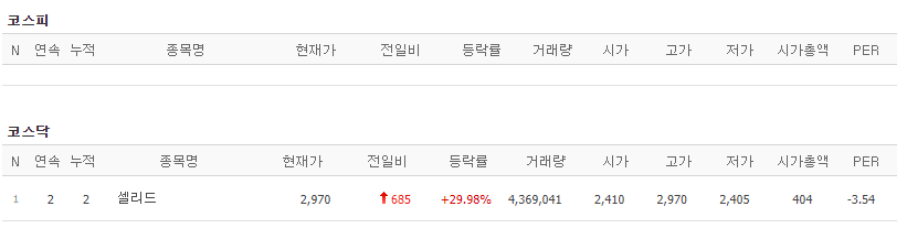 셀리드는 시총 400억대 기업이 되었네요. 어제에 이어 상한가 달성하였는데요.