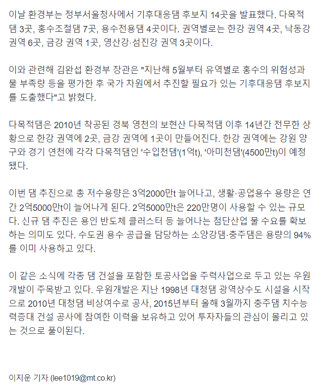 경기부양 정책 중 하나이지요. 또한 기후위기로 인한 홍수와 가뭄을 대비한다는 환경부의 입장입니다.