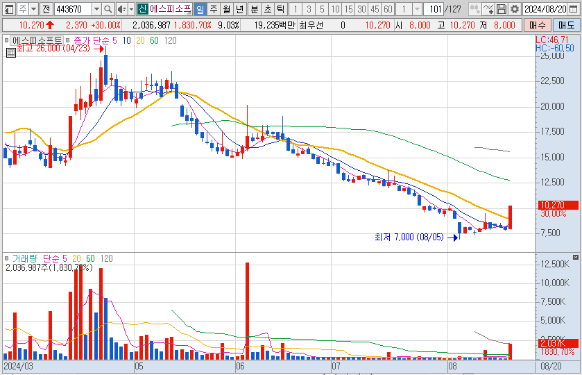 클라우드 컴퓨팅 관련주인 에스피 소프트가 상한가를 간 것으로 보입니다.