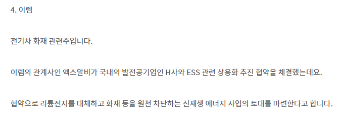 전기차 화재 관련주인데요. 전기차에서 화재 위험이 낮은 전고체에 사용되는 고체 전해질 원료인 황화리튬을 생산하고 있습니다.