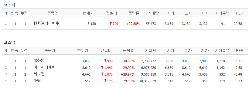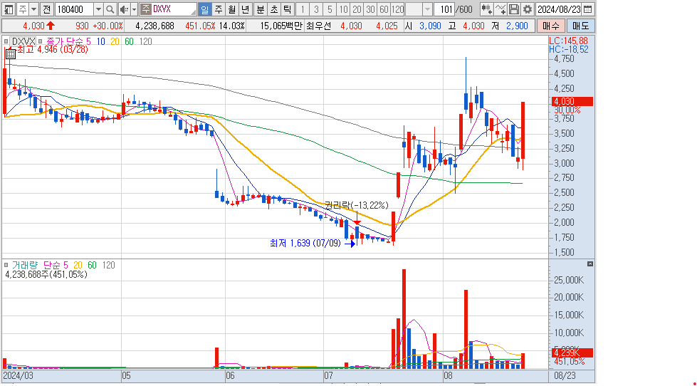 이 주식은 상장적격성 실질 심사 대상으로 거래가 정지되었다가 금일 거래를 재개하며 상한가를 갔네요.