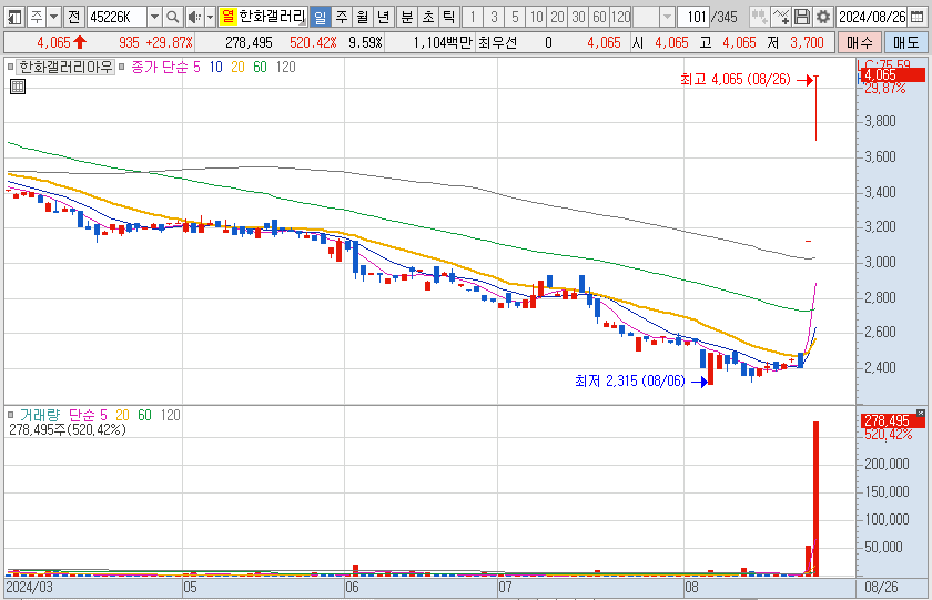 지난주 금요일 한화그룹의 삼남 김동선 한화갤러리아 부사장의 매수소식으로 2 연상 입니다.