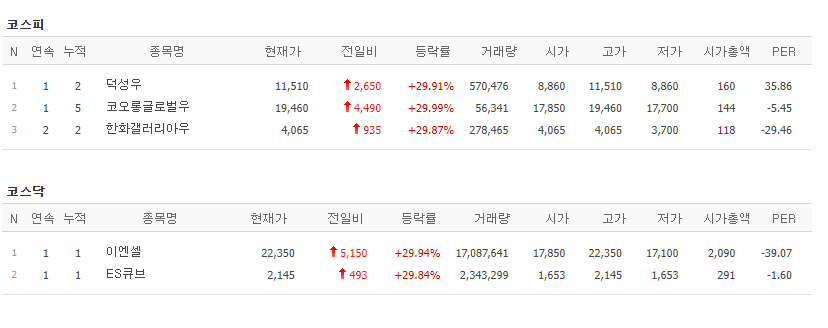 오늘의 상한가 종목들은 모두 시가총액이 작은 특징이 있네요.