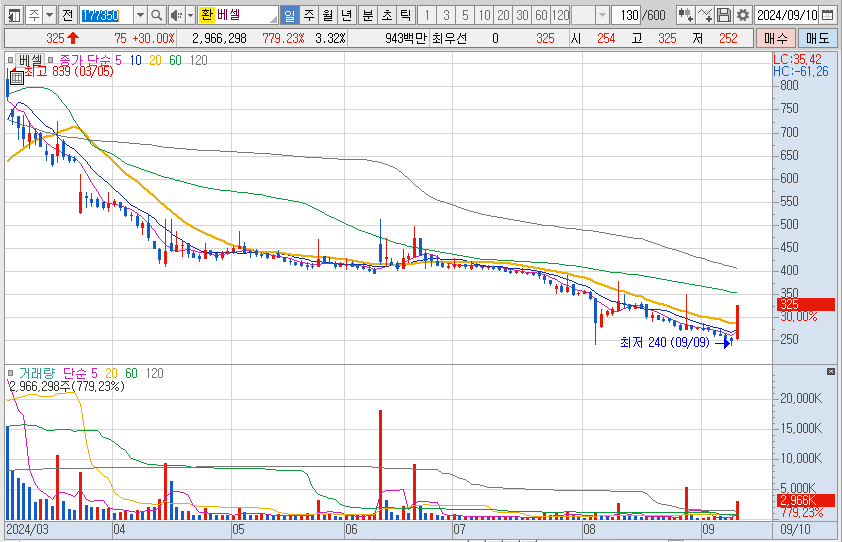 어제에 이어 이틀 연속 상한가인데요. 300억원의 전환사채 발행이라는 대규모 자금조달로 제약바이오 사업, 신약개발에 대한 기대감으로 오른 것으로 보입니다.