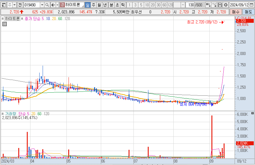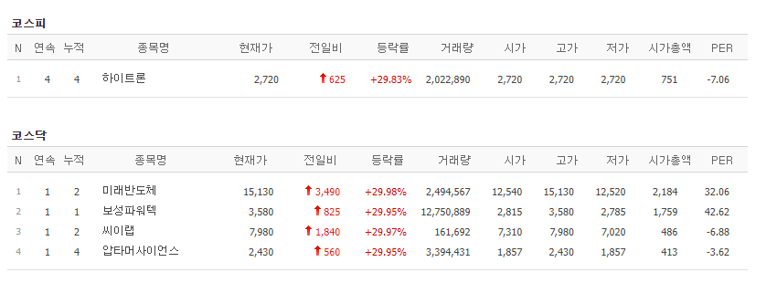이번주 내내 본 하이트론 4일 연속 상한가네요