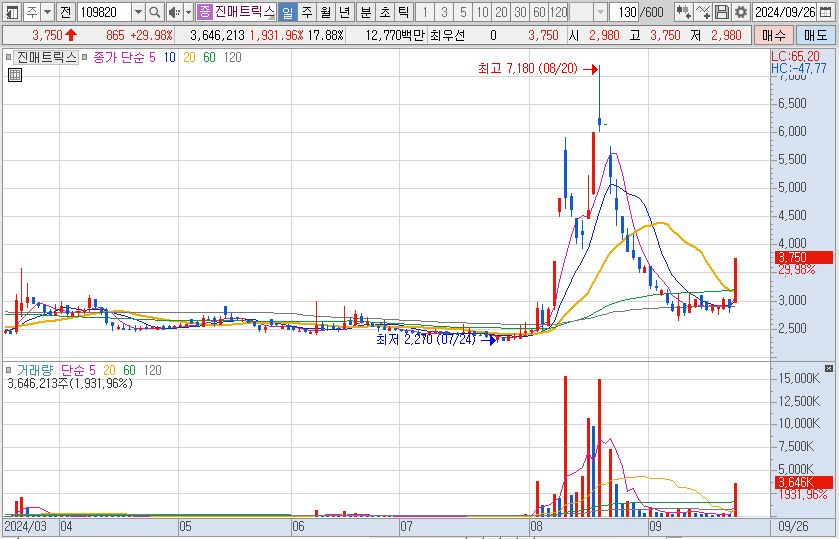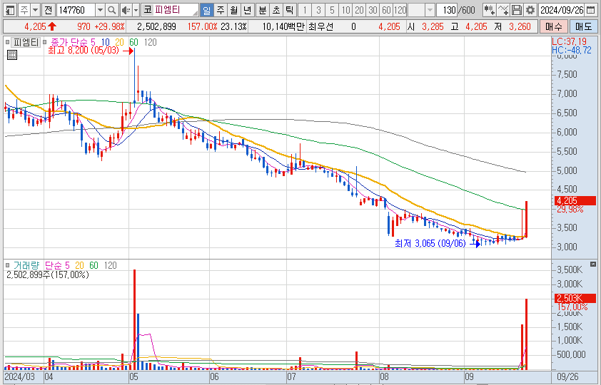 역시 반도체 관련주로 상한가를 간 것으로 보입니다. 피엠티의 프로브 카드는 웨이퍼 테스트에 소요되는 고부가가치의 소모성 부품이며 경쟁력이 있는 제품이라고 합니다.
