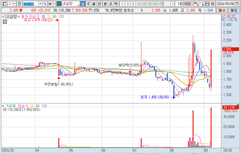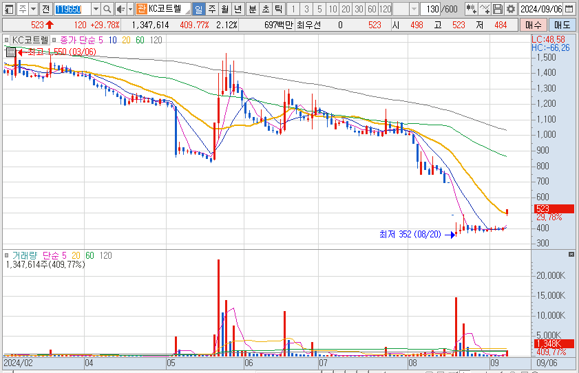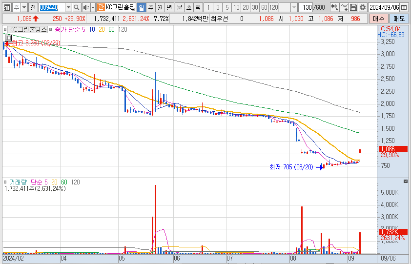 아래의 KC그린홀딩스와 함께 경영난을 겪던 중 금융채권자 협의회를 통해 워크아웃 개시가 결정되어 상한가를 달성했습니다.