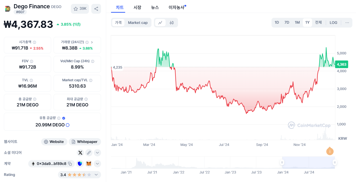 DEGO는 현재 바이낸스에 상장되어있으며 12월 28일 기준 4367원입니다.